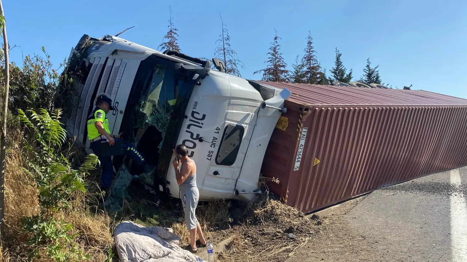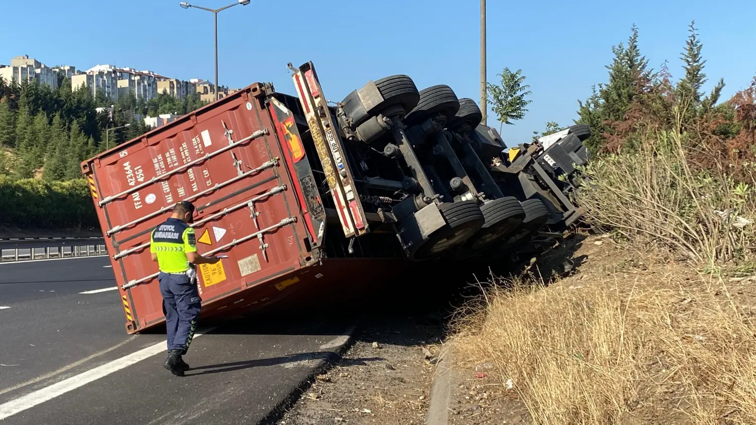 Kocaeli'nin İzmit ilçesi TEM otoyolu geçişinde konteyner yüklü tır devrildi. Sürücü kazayı hafif sıyrıklarla atlattı.