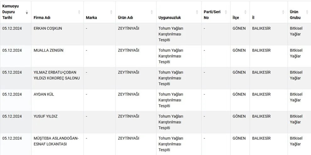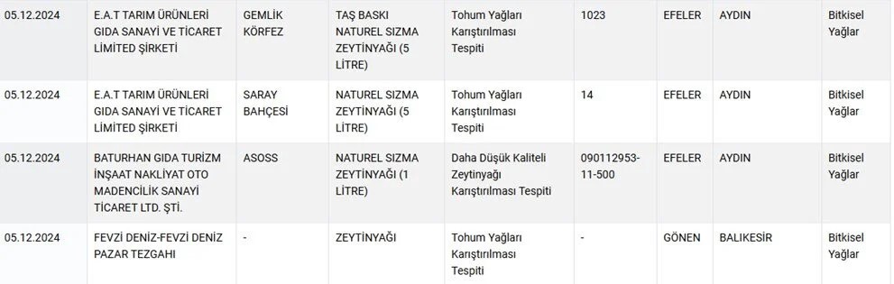 Bitkisel yağın bulunmaması gereken ürünlerde bitkisel yağ yer alması ile söz konusu ürünlere kanatlı eti karıştırılması gibi birçok uygunsuzluk listede yer aldı.