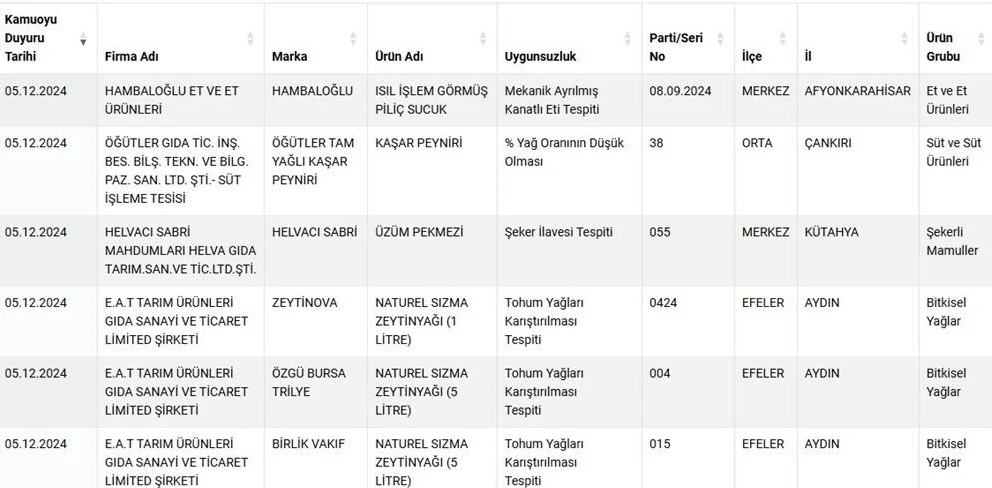 Listeye eklenen ürünlerde gıda kullanımına izin verilmeyen boya tespiti, kaşar peynirinde yağ oranının düşük olması, soya ve nişasta bulunması gibi çeşitli uygunsuzluklar belirlendi.