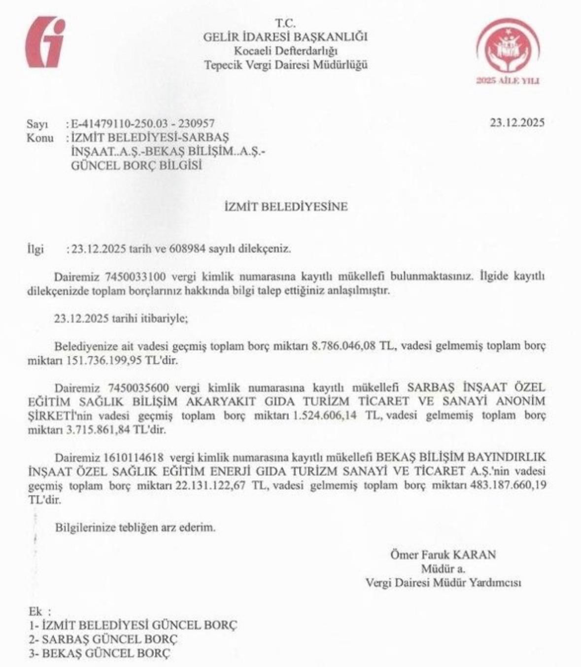 Gelir İdaresi Başkanlığı’na bağlı Kocaeli Defterdarlığı Tepecik Vergi Dairesi Müdürlüğü’nün İzmit Belediyesi’ne gönderdiği resmi yazıya göre, belediye ve iştiraklerinin toplam vergi borcunun 671 milyon TL’ye ulaştığı belirtildi. Bunun üzerine yazılı bir basın açıklaması yapan Kazan, bu rakamın siyasi bir iddia değil, devletin resmi kayıtlarında yer alan açık bir mali gerçek olduğunu ifade etti.