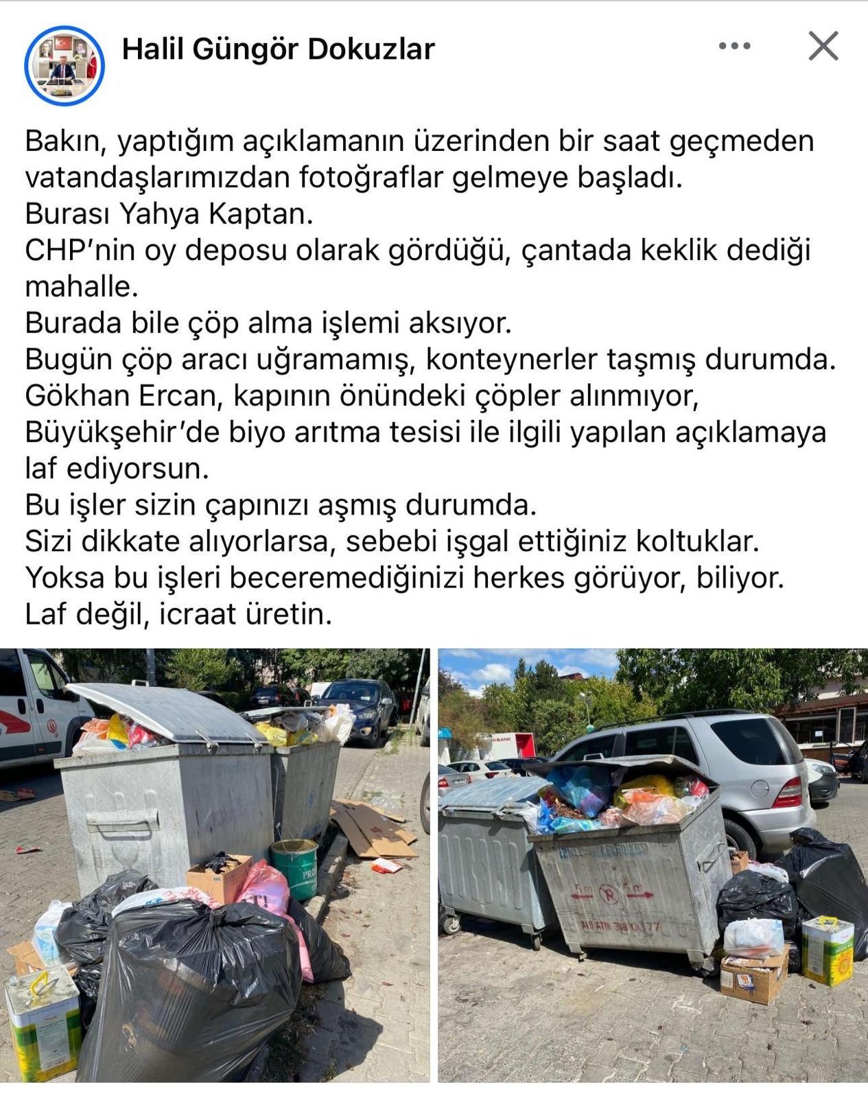 AK Parti İzmit İlçe Başkanı Halil Güngör Dokuzlar, yaptığı paylaşımda şu ifadeleri kullandı: “Bakın, yaptığım açıklamanın üzerinden bir saat geçmeden vatandaşlarımızdan fotoğraflar gelmeye başladı. Burası Yahya Kaptan. CHP’nin oy deposu olarak gördüğü, çantada keklik dediği mahalle. Burada bile çöp alma işlemi aksıyor. Bugün çöp aracı uğramamış, konteynerler taşmış durumda. Gökhan Ercan, kapının önündeki çöpler alınmıyor, Büyükşehir’de biyo arıtma tesisi ile ilgili yapılan açıklamaya laf ediyorsun. Bu işler sizin çapınızı aşmış durumda. Sizi dikkate alıyorsa kamuoyu sebebi işgal ettiğiniz koltuklar. Yoksa bu işleri beceremediğinizi herkes görüyor, biliyor. Laf değil, icraat üretin.”