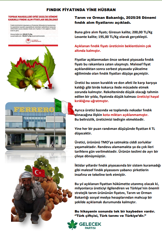 Gelecek Partisi yöneticileri, hükümetin yıllardır fındık piyasasında kalıcı bir sistem kuramadığını, sektörün yabancı şirketlerin tekeline bırakıldığını ifade etti. Ayrıca bu yılki fiyatın yalnızca Tarım ve Orman Bakanlığı’nın sosyal medya hesaplarından, “mahcup bir şekilde” duyurulması da eleştiri konusu oldu. Açıklama, şu sözlerle sona erdi: “ Bu hikâyenin sonunda tek bir kaybeden vardır: Türk çiftçisi, Türk tarımı ve Türkiye.”