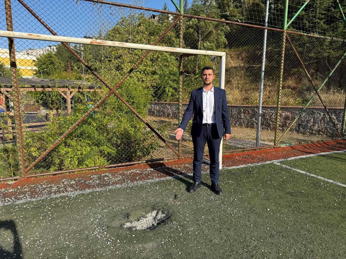 Mutluluk Parkı’ndaki eksikleri tek tek sıralayan Akbal, halı sahada kalenin önünde kocaman bir çukur olduğunu, tel örgülerin paslandığını, topların kaçtığı filelerin yarım kaldığını ve parkta bulunan bankların dahi oynar durumda olduğunu söyledi.