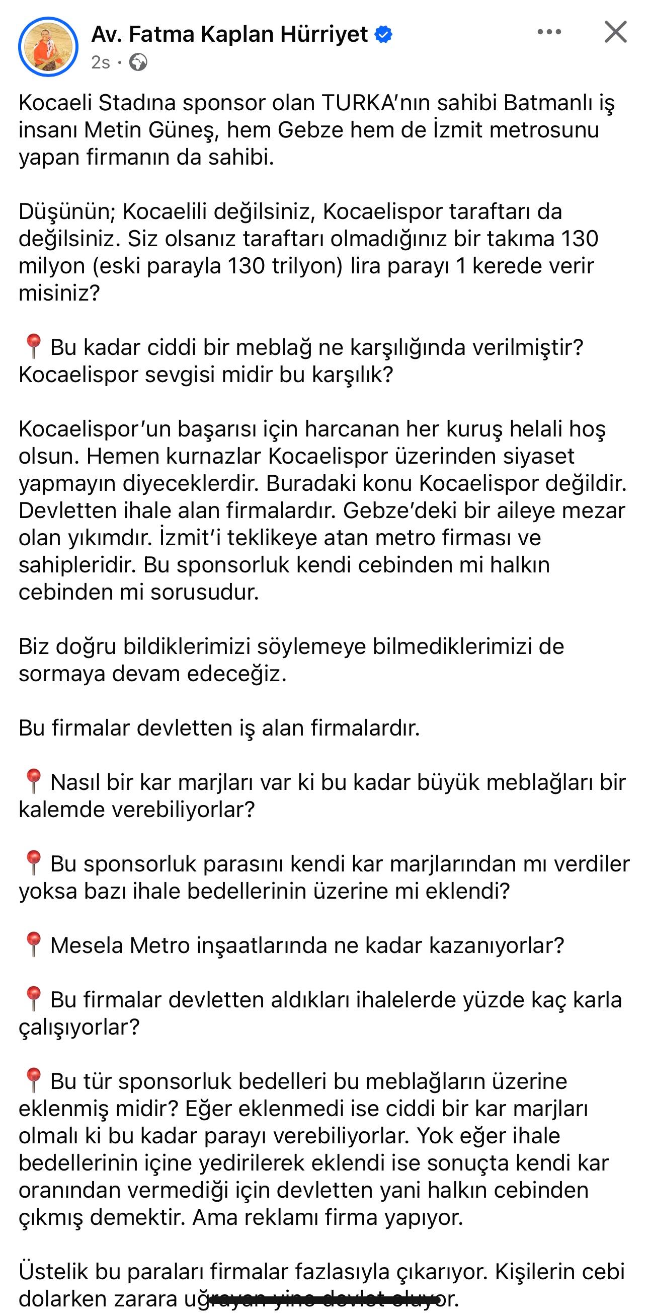 İzmit Belediye Başkanı Fatma Kaplan Hürriyet, sosyal medya hesabından yaptığı çarpıcı açıklamayla Kocaelispor’un yeni stat sponsorluğunu üstlenen TURKA firmasını ve firmanın sahibi Metin Güneş’i hedef aldı. Hem Gebze hem de İzmit metrosunu yapan şirketin aynı zamanda Kocaeli Stadyumu’na 130 milyon TL’lik sponsor olması, Hürriyet’in gündeminde geniş yer tuttu.