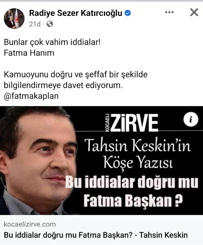 AK Parti İzmit İlçe Başkanı Muharrem Tutuş'un gerek meclis kürsüsünden, gerekse sosyal medya hesabı üzerinden sürekli gündeme getirdiği İzmit Belediyesi’nde ki organize işler, aynı çetenin içerisinde bulunan bir ismin Gazeteci Tahsin Keskin'e itirafıyla su yüzüne çıktı. Kamuoyuna bomba gibi düşen skandal iddiaların bulunduğu köşe yazısını paylaşan AK Parti Kocaeli Milletvekili Radiye Sezer Katırcıoğlu, "Bunlar çok vahim iddialar! Fatma Hanım. Kamuoyunu doğru ve şeffaf bir şekilde bilgilendirmeye davet ediyorum." dedi