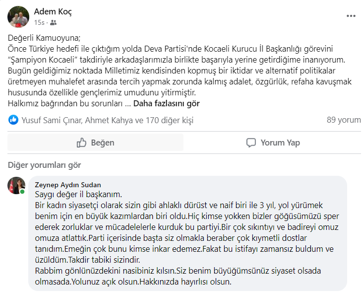 Geride bıraktığımız seçimlerde milletvekili aday adayı olmak için il başkanlığı görevinden istifa eden Adem Koç listede yer almamıştı. Koç sosyal medya hesabı üzerinden yaptığı açıklama ile parti üyeliğinden de istifa ettiğini duyurdu. Koç’un yaptığı paylaşımın altına geçtiğimiz günlerde DEVA Partisi Kocaeli İl Başkanı olarak atanan Zeynep Aydın Sudan’dan yorum geldi. Sudan, yaptığı yorumunda “Bu istifayı zamansız buldum ve üzüldüm. Takdir tabi ki sizindir.” İfadelerine yer verdi.