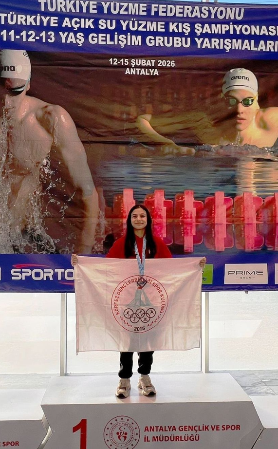 Körfez Gençlerbirliği Spor Kulübü’nden yapılan açıklamada, “Antalya’da yapılan Türkiye Yüzme Federasyonu tarafından düzenlenen Türkiye Açık Su Yüzme Kış Şampiyonası 11-12-13 Yaş Gelişim Grubu Yarışmalarına 6 sporcumuz 2 antrenör eşliğinde katılmışlar ve elde ettikleri derecelerle kulübümüzü ve şehrimizi başarıyla temsil etmişlerdir. Yüzlerce güçlü ve iddialı rakipleri arasında 11 yaş grubunda Poyraz Kaan Kaya Türkiye Şampiyonu olurken, Senem Altundağ Türkiye üçüncüsü, Zehra Temel altıncı ve Deva Çakır sekizinci olurken yarışlara katılan diğer iki sporcumuz da kendi derecelerini geliştirerek sıralamada yer almayı başarmışlardır.
