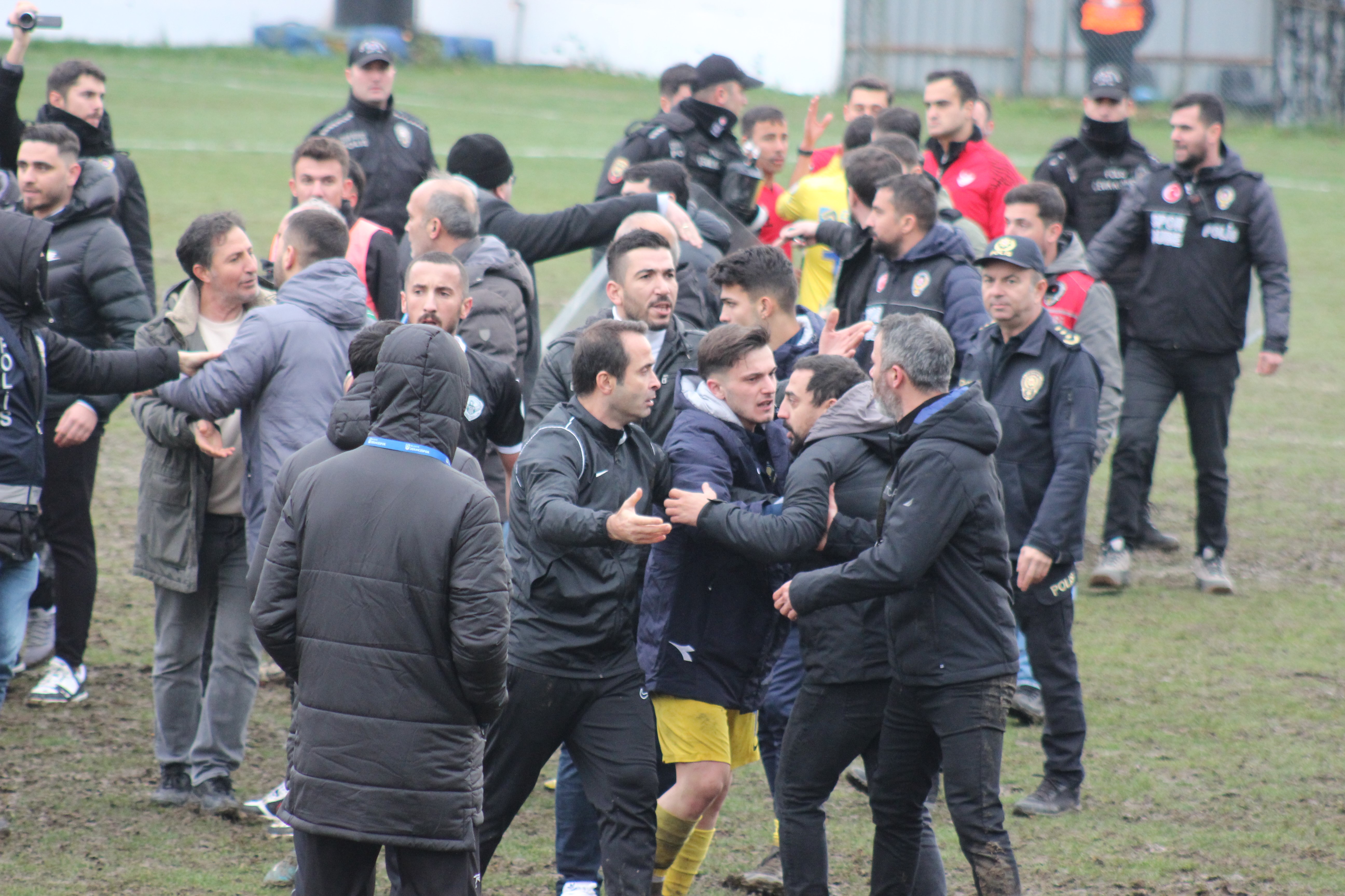 Konuk ekipten Emrullah Ertuş’un tepkisiyle başlayan sözlü, el kol hareketli atışma yedek kulübesine taştı. Ardından kaleci Mustafa Güngör’ün de dahil olmasıyla iki takımın sahadaki oyuncuları arasında kavga başladı. Teknik ekipler, yedek oyuncular ve yöneticiler de sahaya girdi. Tribünlerdeki taraftar da büyük tepki gösterdi ve gerilimin uzaması üzerine sahaya girmek istedi. Ancak emniyet güçleri sahaya inmelerine izin vermedi. Bu dakikalarda maçın hakemleri sahanın uzak bir bölgesine giderek emniyet güçlerinin koruması altına alındı.