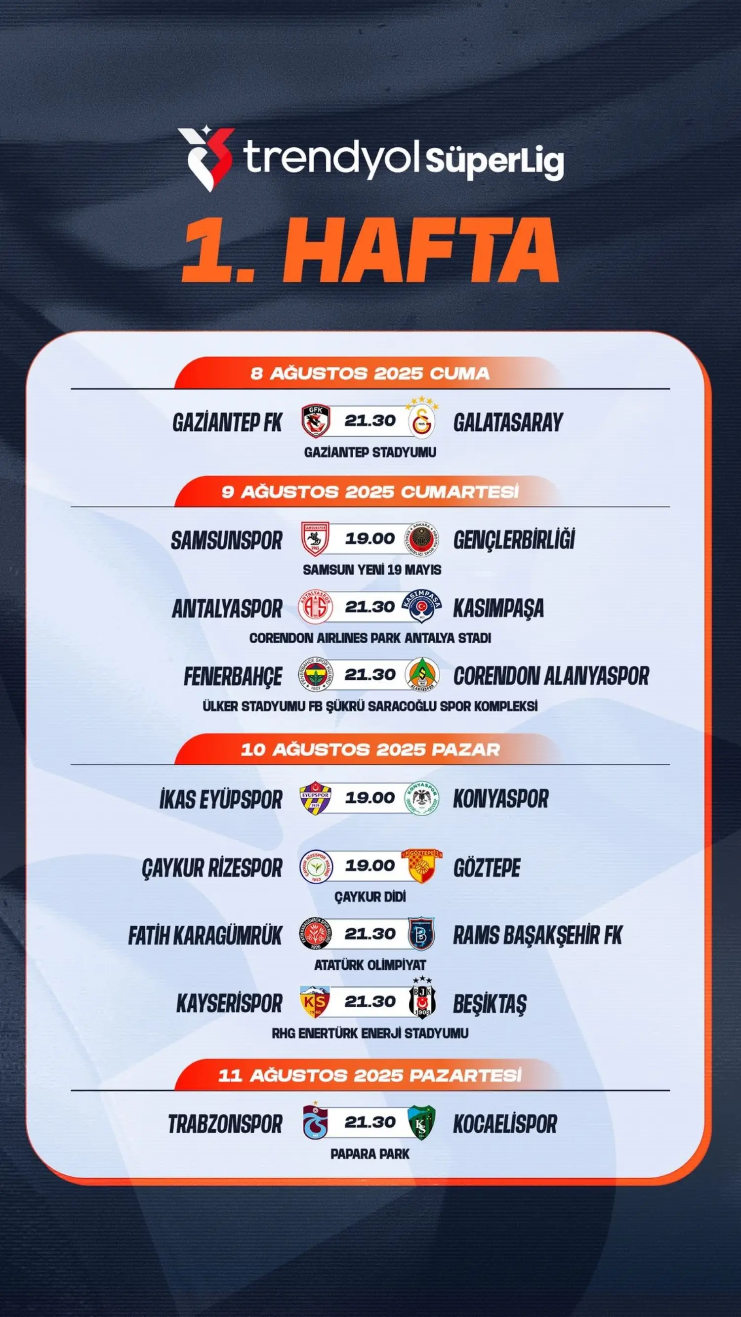 Süper Lig'de 1 ve 2. haftanın programı şu şekilde: