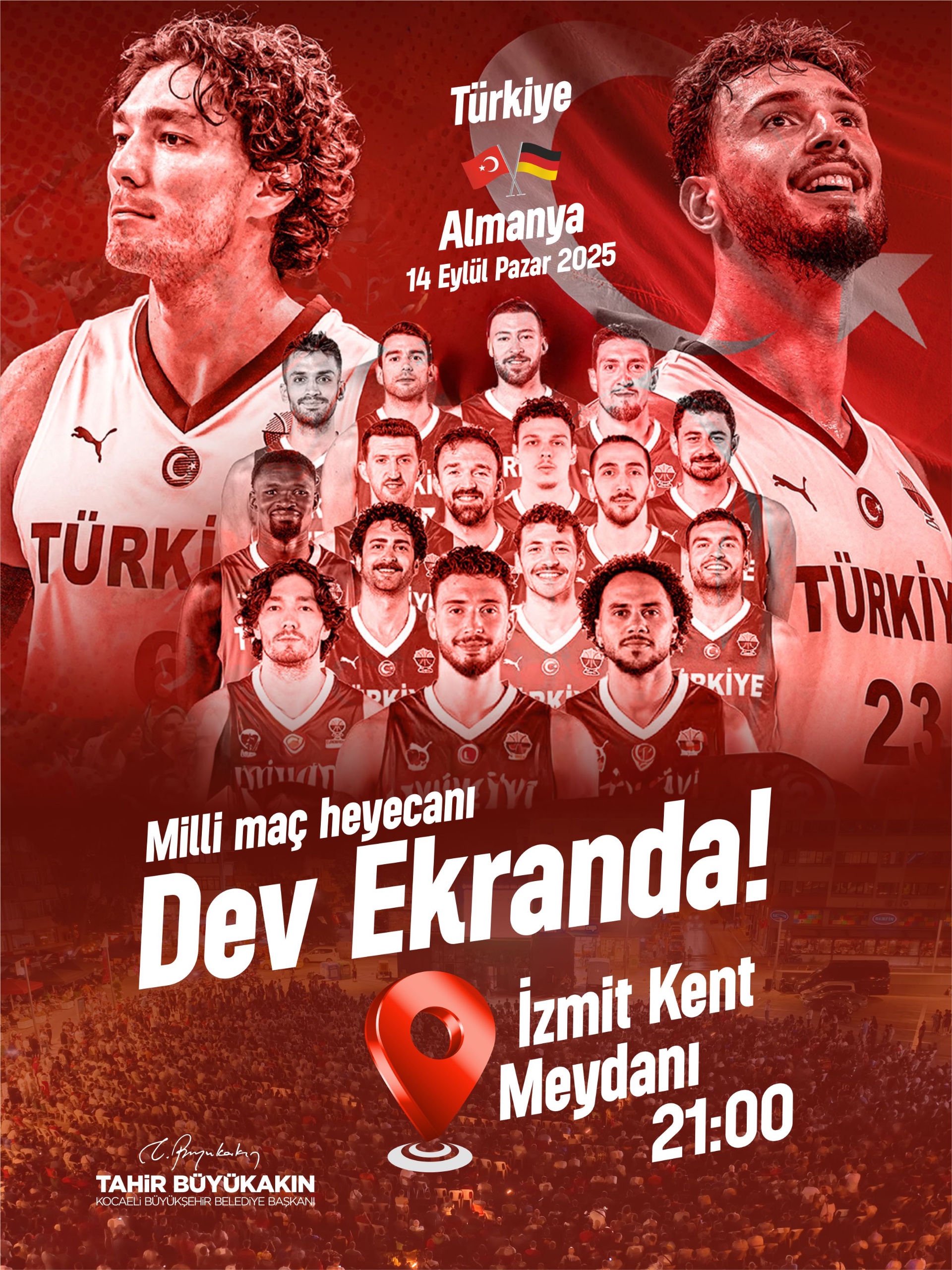 Kocaeli Büyükşehir Belediyesi, EuroBasket 2025’te Milli Basketbol Takımımızın heyecan dolu mücadelelerini dev ekranda yayınlamaya devam ediyor. Yunanistan ile oynanan yarı final maçında binlerce Kocaelili, nefes kesen mücadeleyi Büyükşehir Belediyesi’nin İzmit Kent Meydanı’nda kurduğu dev ekranda izlemiş ve yarı final coşkusunu hep birlikte yaşayarak unutulmaz bir gece yaşamıştı. Yunanistan’ı 94-68 yenerek 24 yıl aradan sonra EuroBasket’te finale yükselen 12 Dev Adam, Almanya engelini de geçerek adını Avrupa şampiyonluğuna yazdırmak istiyor. Kocaelililer de bu coşkuyu yaşamak için İzmit Kent Meydanı’nda tek yürek olacak.