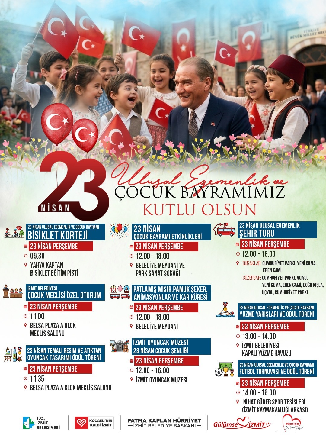 İzmit Belediyesi, 23 Nisan Ulusal Egemenlik ve Çocuk Bayramı kapsamında gün boyu sürecek kortej, etkinlikler ve spor organizasyonlarıyla çocuklara bayram coşkusu yaşatacak