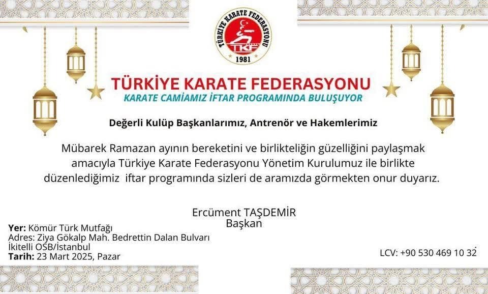 Öncelikle, 23 Mart Pazar günü İstanbul Kömür Türk Mutfağı İkitelli'de bir iftar buluşması planlanıyor. Karate camiası, bu yoğun temponun içinde biraz soluklanıp dostça bir ortamda bir araya gelecek. Müsabakalarda rekabet ne kadar yüksek olursa olsun, işin sonunda dostluk ve birlik her zaman ön planda.